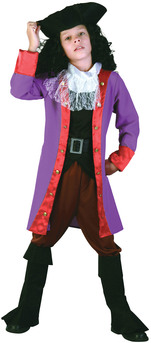 Pirate hook costume - includes shirt with jacket, jabot, trousers, hat, belt & boot tops. Medium (height 122cm - 134cm) large (height 134cm - 146cm)