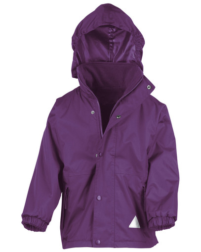 Storm winter waterproof reversible jacket - anti pilling fleece - waterproof - windproof - double stitched taped seams - concealed hood in collar with tear release fastening - reversible full front zip fastening - elasticated cuffs - stud closing storm flap - strong self fabric hang tab - storm stuff reflective warning safety patch (upper back) - pocket label with space for name and class - safety triangles incorporating 3m™ scotchlite™ reflective materials - this garment contains over 25% recycled materials