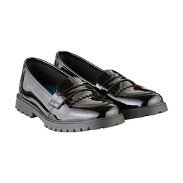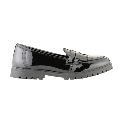 For on-trend kids, the Willow Patent has been designed to appeal to the fashion conscious child, and to look after their developing feet. The chunky, strong grip and fashionable sole makes this black school shoe grown up and iconic, whilst the Term comfort features ensure easy all day wear. The slip-on moccasin design is practical and a very popular style amongst school kids. This patent leather shoe makes cleaning easy, just wipe with a damp cloth.